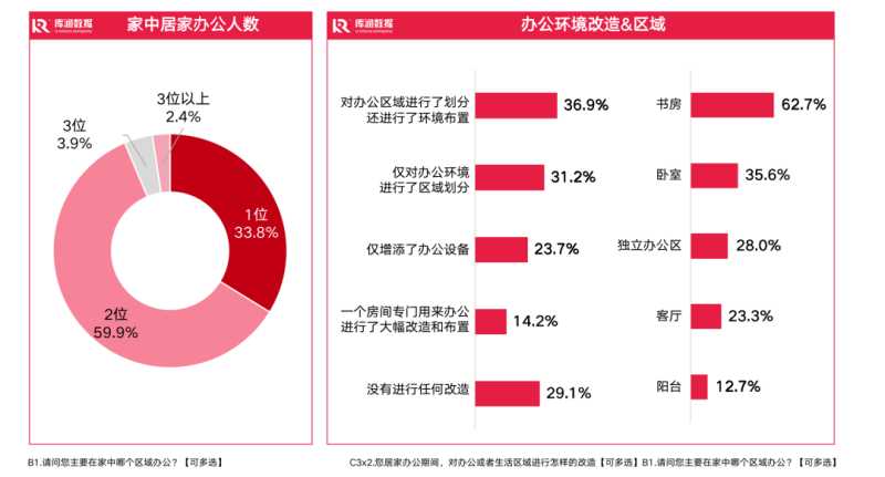 大部分家庭有两位成员居家办公,并且他们在家中对办公区域进行划分和环境布置,更多人会在书房办公。