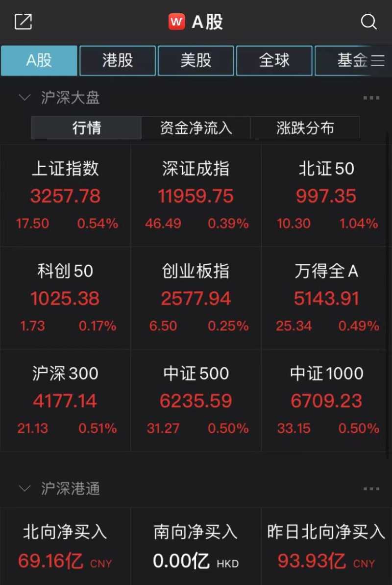 沪指半日涨0.54%,北向资金“扫货”69亿,电信三巨头集体大涨