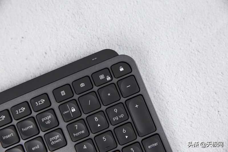 罗技MX KEYS在外观上才用了圆弧形的全键盘设计,外形线条流畅硬朗,小键盘的设计在办公输入数据的时候还是比较便捷的。键盘在主键盘区和小键盘区的键帽上都进行了一个凹面的设计,凹面的设计比较贴合手型,再加上哑光的设计,能给用户带来特别好的手感与反馈感。