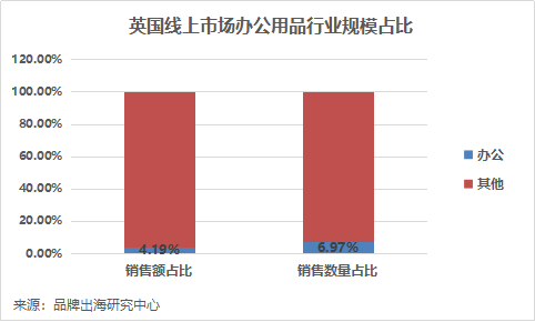 品牌出海研究中心通过线上销售数据分析,得出英国线上市场办公用品行业的规模情况,其销售数量占比整体线上市场的6.97%,是英国线上市场规模排名第5的行业。线上销售额占比整体线上市场的4.19%,均价在20英镑左右。英国调研机构Technavio的数据显示,全球办公用品市场发展势头强劲,预计到2019年,市值将有望突破2,170亿美元。