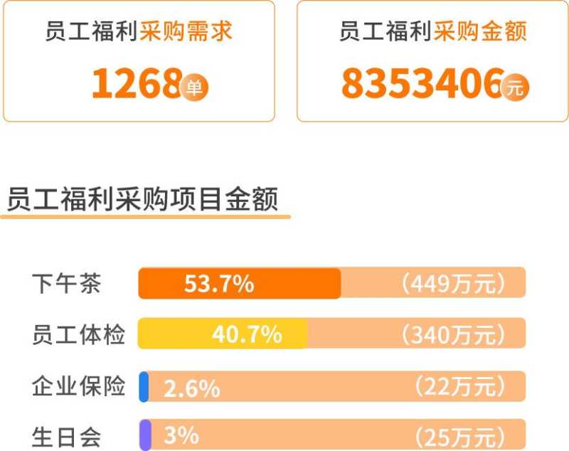 员工福利包括节庆福利、下午茶、活动茶歇、员工体检、企业保险、生日服务、特惠茶点等7个项目。受疫情影响,员工福利的采购量下降比较明显。