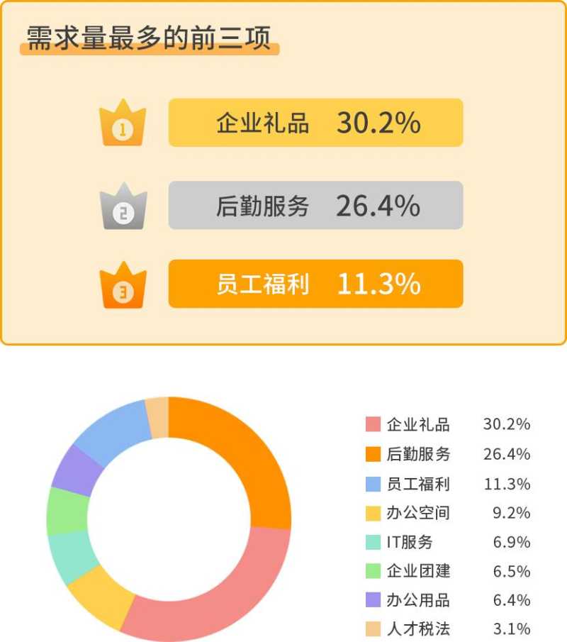 从数据上看采购需求量多并不代表采购金额大,办公空间、后勤服务、企业礼品,几乎占到了总采购金额的80%以上。