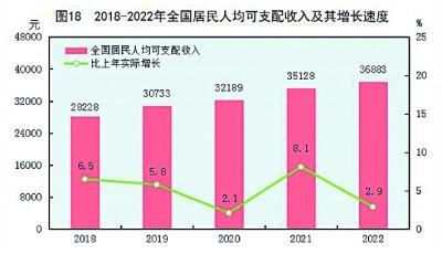全年全国居民人均可支配收入36883元,比上年增长5.0%,扣除价格因素,实际增长2.9%。全国居民人均可支配收入中位数[51]31370元,增长4.7%。按常住地分,城镇居民人均可支配收入49283元,比上年增长3.9%,扣除价格因素,实际增长1.9%。城镇居民人均可支配收入中位数45123元,增长3.7%。农村居民人均可支配收入20133元,比上年增长6.3%,扣除价格因素,实际增长4.2%。农村居民人均可支配收入中位数17734元,增长4.9%。城乡居民人均可支配收入比值为2.45,比上年缩小0.05。按全国居民五等份收入分组[52],低收入组人均可支配收入8601元,中间偏下收入组人均可支配收入19303元,中间收入组人均可支配收入30598元,中间偏上收入组人均可支配收入47397元,高收入组人均可支配收入90116元。全国农民工人均月收入4615元,比上年增长4.1%。全年脱贫县[53]农村居民人均可支配收入15111元,比上年增长7.5%,扣除价格因素,实际增长5.4%。