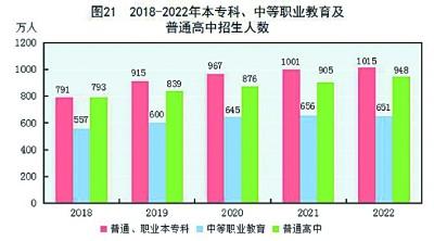 全年研究生教育招生124.2万人,在学研究生365.4万人,毕业生86.2万人。普通、职业本专科[65]招生1014.5万人,在校生3659.4万人,毕业生967.3万人。中等职业教育[66]招生650.7万人,在校生1784.7万人,毕业生519.2万人。普通高中招生947.5万人,在校生2713.9万人,毕业生824.1万人。初中招生1731.4万人,在校生5120.6万人,毕业生1623.9万人。普通小学招生1701.4万人,在校生10732.0万人,毕业生1740.6万人。特殊教育招生14.6万人,在校生91.9万人,毕业生15.9万人。学前教育在园幼儿4627.5万人。九年义务教育巩固率为95.5%,高中阶段毛入学率为91.6%。(见图21)
