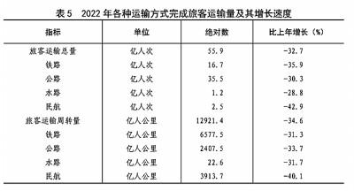 全年旅客运输总量56亿人次,比上年下降32.7%。旅客运输周转量12921亿人公里,下降34.6%。(见表5)