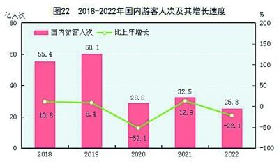 全年国内游客25.3亿人次,比上年下降22.1%。其中,城镇居民游客19.3亿人次,下降17.7%;农村居民游客6.0亿人次,下降33.5%。国内旅游收入20444亿元,下降30.0%。其中,城镇居民游客花费16881亿元,下降28.6%;农村居民游客花费3563亿元,下降35.8%。(见图22)