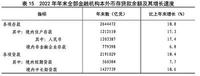 全年社会融资规模增量[43]32.0万亿元,按可比口径计算,比上年多0.7万亿元。年末社会融资规模存量[44]344.2万亿元,按可比口径计算,比上年末增长9.6%,其中对实体经济发放的人民币贷款余额212.4万亿元,增长10.9%。年末全部金融机构本外币各项存款余额264.4万亿元,比年初增加25.9万亿元,其中人民币各项存款余额258.5万亿元,增加26.3万亿元。全部金融机构本外币各项贷款余额219.1万亿元,增加20.6万亿元,其中人民币各项贷款余额214.0万亿元,增加21.3万亿元。人民币普惠金融贷款[45]余额32.1万亿元,增加5.6万亿元。(见表15)