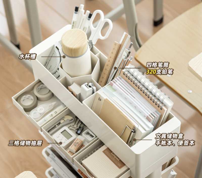 如果你的办公物品比较多,办公桌又比较小,可以果断给自己置办「桌边收纳神器」。顶层可收纳水杯、各类文具、笔记本、小杂物,下层是书架形式,分类放置各类书籍、学生档案、试卷等,再多都不是问题。