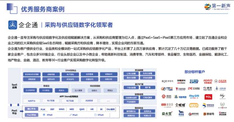 为了解中国企业级SaaS行业真实发展现状及未来趋势,第一新声持续追踪行业动态,整理并发布《2022年中国高成长企业级SaaS行业研究报告》,该报告根据多方面综合评估后推荐中国SaaS代表性厂商,企企通作为供应链采购数字化领跑者,凭借技术创新与产品优势成功入选。