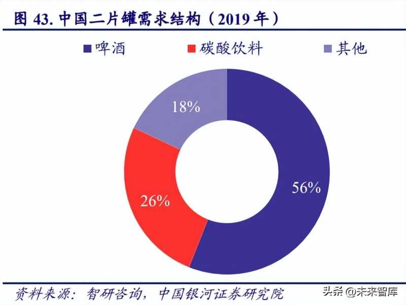 二片罐需求稳步增长,结构以啤酒和碳酸饮料为主。据智研咨询统计数据显示,2020 年 中国二片罐需求量为 521.8 亿罐,同比增长 1.83%;市场规模为 229.59 亿元,同比增长 6.69%。 结构来看,中国二片罐需求以啤酒和碳酸饮料为主, 2019 年中国二片罐需求中,啤酒占比 56%,碳酸饮料占比 26%。啤酒销量维持稳定,罐化率持续提升。据 Euromonitor统计及预测,中国啤酒销量位列全 球第一,2021 年达到 443.61 亿升,同比提升 5.05%,预计将于 2026 年达到 438.49 亿升,基 本维持稳定。啤酒包装方面,中国啤酒罐化率稳步提升,2021 年达到 29.5%,对标日美 (90.49%、70.19%)还有较大提升空间,预计将于 2026 年达到 33.19%,将贡献啤酒金属包 装增量需求。