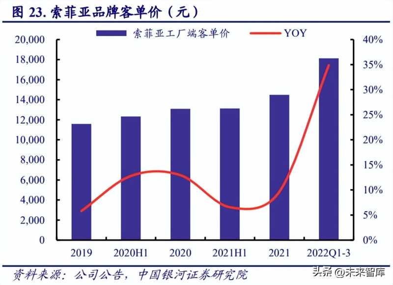 整家战略实现品类协同,客单价增长未来可期。家居龙头推出整家战略实现品类协同, 将单一空间定制扩大至整个家居环境,既满足消费者一站式购物需求,又充分挖掘客流消费 潜力,实现客单价提升,以索菲亚为例,2022 年前三季度,索菲亚工厂端客单价达到 18,133 元,同比增长 34.89%。我们认为,后续家居龙头客单价仍有较大提升空间,索菲亚推动 C6 计划,欧派同样有相关规划,后续有望持续通过产品升级&品类协同&空间拓展等方式提升 单客消费。