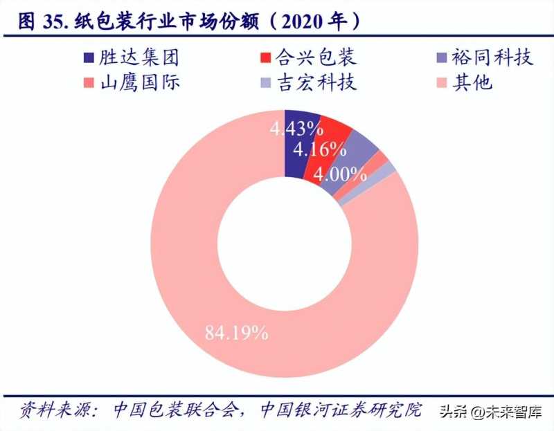 纸包装规模持续扩容,份额分散未来有望集中。伴随“绿色经济”不断深化发展,纸包 装需求日益旺盛,应用范围持续扩大。据中国包装联合会统计,2021 年中国纸和纸板容器制 造行业规模以上企业营业收入达到 3,192.03 亿元,同比增长 10.65%,为 2016 年以来首次实现 正增长。竞争格局来看,纸包装业务营收过百亿的三家企业分别为胜达集团/合兴包装/裕同 科技,市场份额分别为 4.43% / 4.16% / 4%。