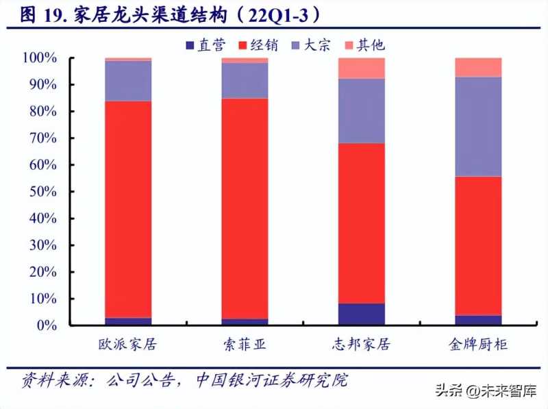 2、深耕零售稳健发展,品类协同推动扩张。经销渠道为基本盘,业绩表现稳健。经销渠道为家居企业主要经营渠道,2022 年前三季 度,定制家居一线龙头经销渠道占比超过 80%,欧派家居/索菲亚占比分别为 80.91% / 82.35%; 二线龙头经销渠道占比超过 50%,志邦家居/金牌厨柜占比分别为 59.71% / 51.8%。同时,行 业承压背景下,家居龙头经销渠道维持稳健成长,2022 年前三季度增速维持在 6%以上。
