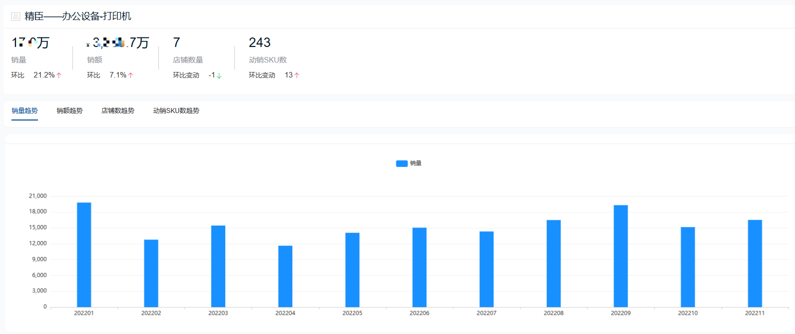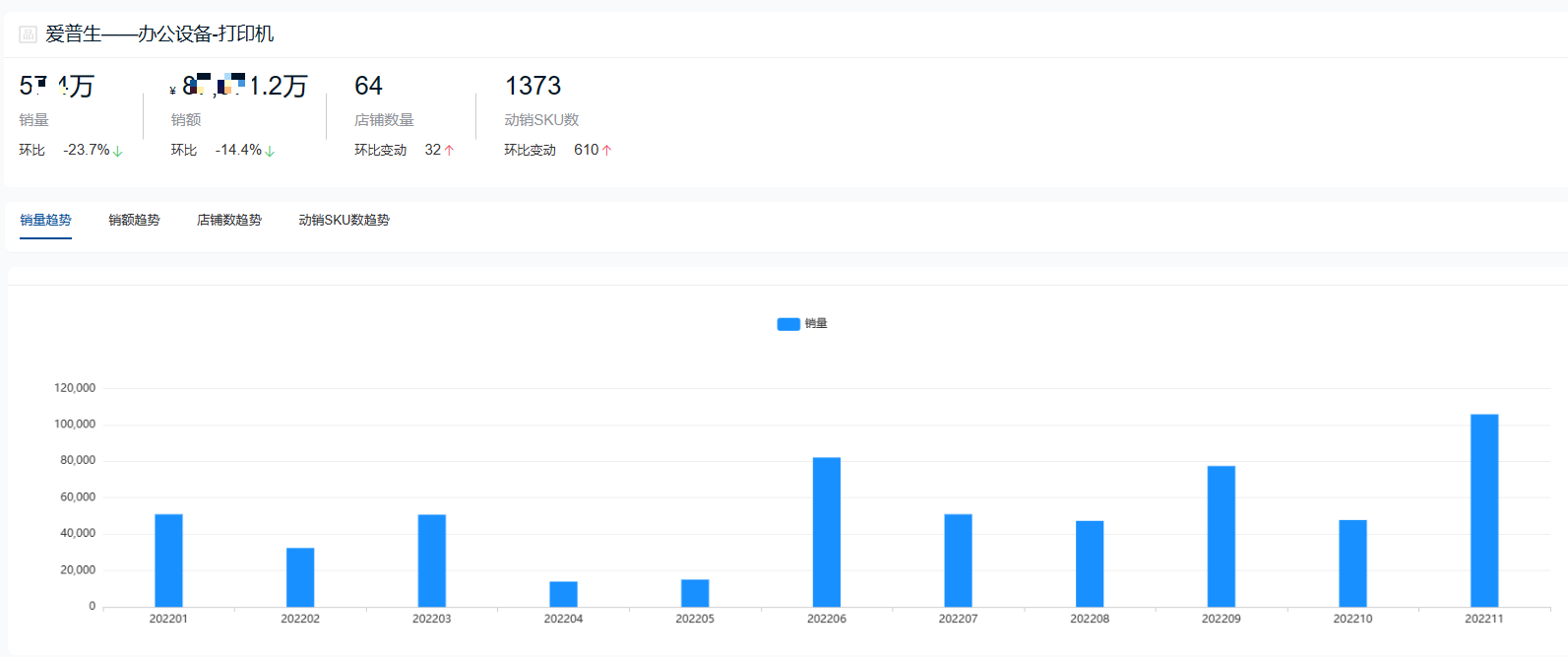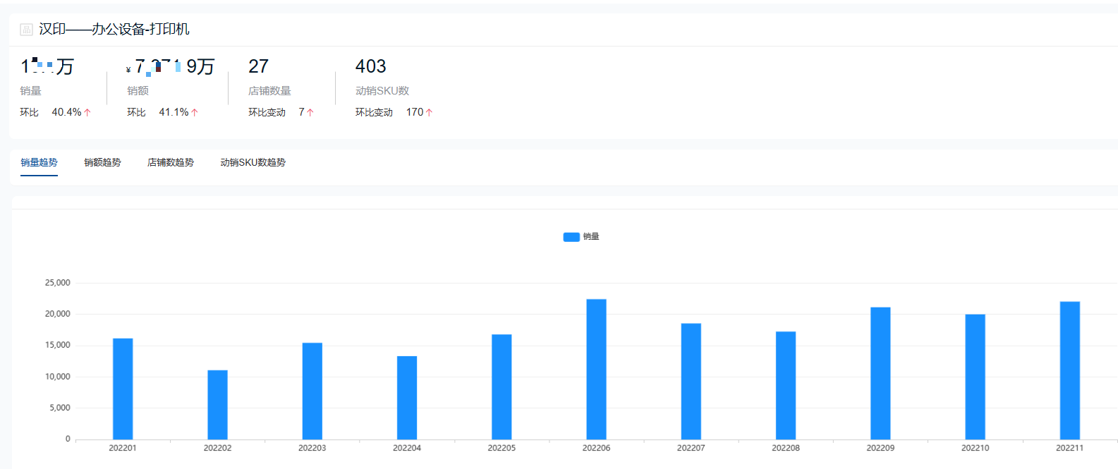 2022年在打印机领域惠普品牌整体销售成绩位列第一,全年总销量超229万件,总销售额超25亿元。今年11月份,惠普的销售成绩达到全年最高,单月销量超38万件,销售额超4亿元。目前在京东平台上,惠普打印机的相关店铺共64家,每个月动销sku数量共3438个。