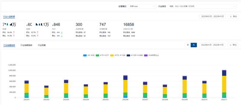 根据鲸参谋平台的数据统计,2022年京东平台打印机的年度总销量超716万件,同比去年增长14.3%;此外,京东平台打印机今年的年度销额累计超60亿元,同比去年增长了13.2%。