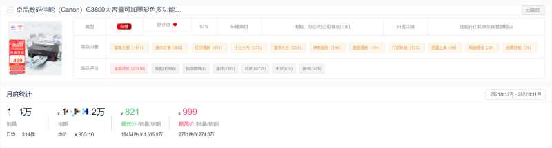 通过鲸参谋平台热销商品的监控,可以看出佳能最热销的商品是这款“G3800大容量可加墨彩色多功能无线一体机”,2022年在京东平台累计销售超11万件,累计销售额超1亿元。佳能这款打印机的历史最低价为821元,最高价为999元。