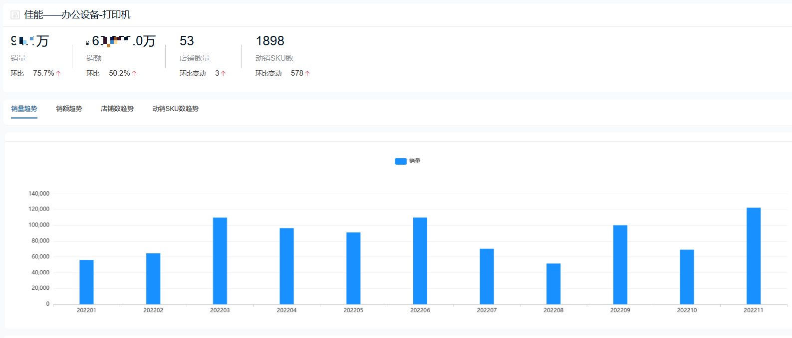 佳能今年整体的排名是第二名,仅次于惠普。2022年全年佳能打印机的总销量超94万件,总销售额近7亿元。2022年11月份,佳能的销售成绩达到全年最高峰,单月销量近12万件,销售额超9100万元。目前,京东平台上有佳能打印机相关店铺53家,每个月的动销sku数量达1898个。