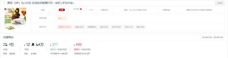 惠普的这款“无线彩色喷墨家用打印机”是年度热销商品,在京东平台上累计销售超过25万件,累计销售额超1亿元。据统计,惠普这款打印机的历史最低价为377元,最高价为499元。