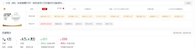 小米的这款“喷墨打印一体机家用打印机”是小米热销商品中排名第一的产品。2022年在京东平台共销售15万件,销售额超8600万元。小米这款打印机的历史最低价曾降至451元,最高价为599元。