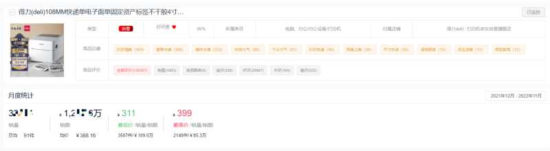 得力的这款“快递仓储物流外卖条码打印机”是该品牌的热销商品,2022年在京东平台上累计销售超3.3万件,累计销售额超1200万元。得力这款打印机的历史最低价为311元,最高价为399元。