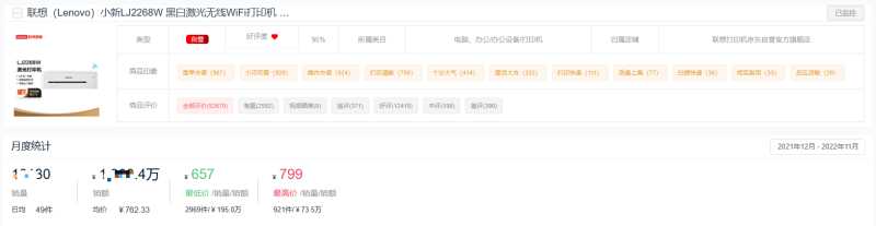 联想品牌中比较受欢迎的是这款“黑白激光无线WiFi打印机”,今年在京东平台上共销售1.8万多件,累计销售额超1300万元。这款打印机的历史最低价为657元,最高价达799元。