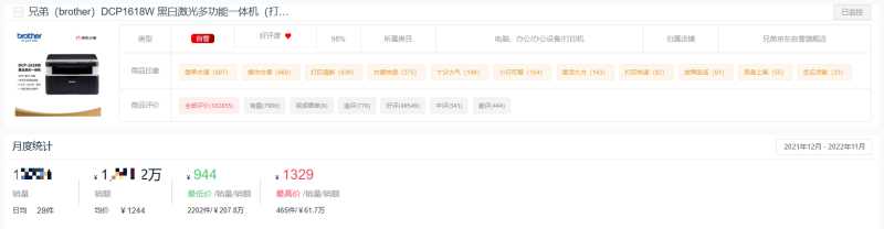 兄弟品牌的热销产品为这款黑白激光多功能一体机 ,今年在京东平台共销售超1万件,销售额超1200万元。这款打印机的历史最低价为944元,最高价为1329元。