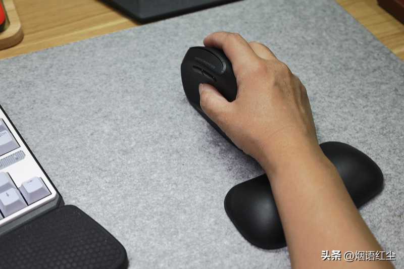这款鼠标的最大亮点,还是其人体工学设计。立式的设计,在竖握时能够彻底解放手腕。大家可以感受一下,假如鼠标是平式设计,我们在握着鼠标移动时,是手在左右移动,手腕活动非常严重,如果长时间活动,手腕就会出现毛病,这也是长久办公人员患有肌腱炎的原因。而立式的鼠标,我们在使用时,是整个手臂一起移动,大大减少了手腕的活动伤害。