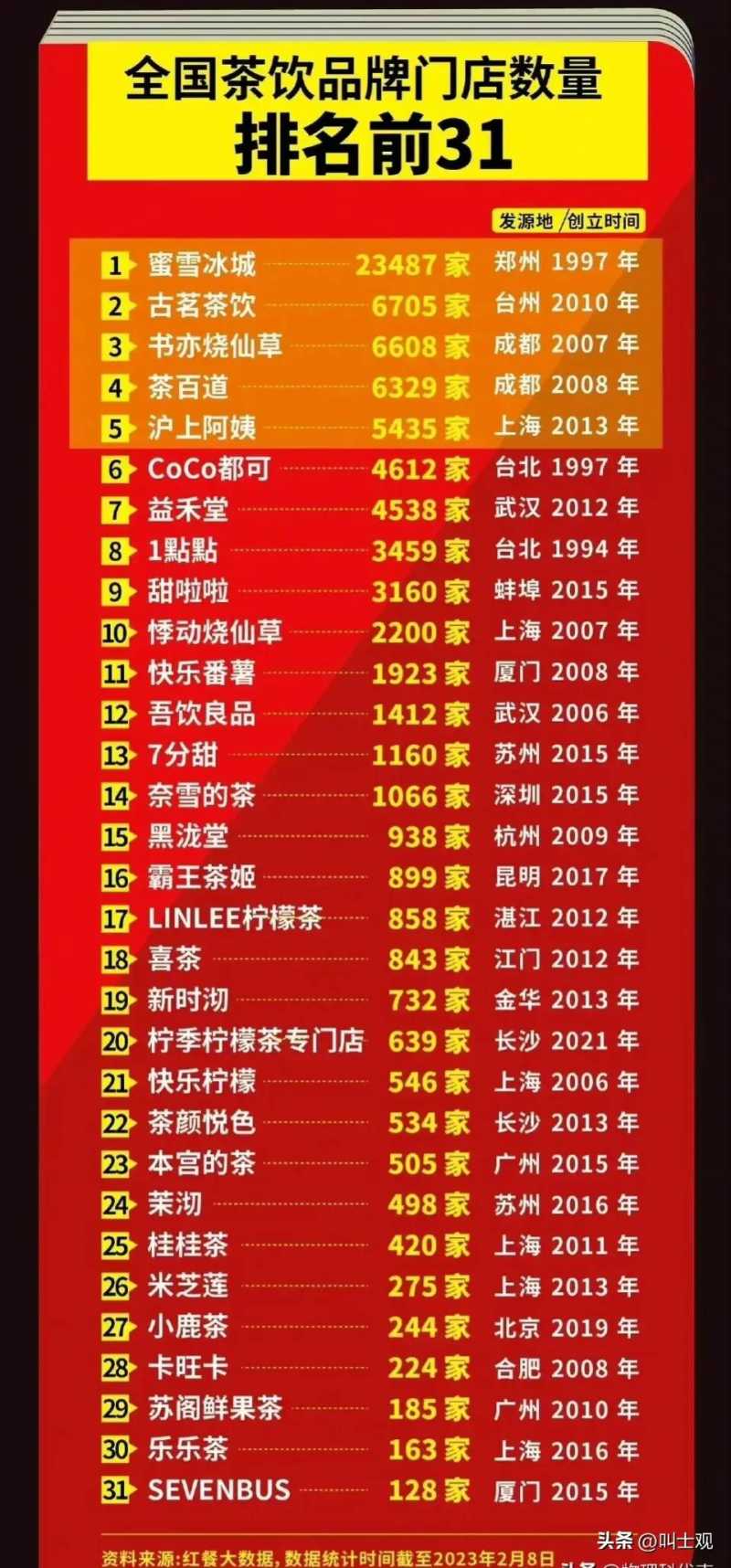 中国餐饮店最新排名:蜜雪冰城第一,霸王茶姬挤进前十 中国餐饮店最新排名:蜜雪冰城第一,霸王茶姬挤进前十2025年最新的中国餐饮店排行榜出来了。蜜雪冰城以超过3万家门店排第一,瑞幸咖啡第二,海底捞第四,肯德基第五,麦当劳第六。新开茶饮店霸王茶姬拿了第八名,西 ... 餐饮行业07-03