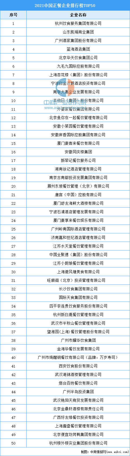 中商情报网讯:近日,中国饭店协会发布《2021中国餐饮业年度报告》,并发布正餐企业TOP50、火锅企业TOP20、团餐企业TOP20及快餐小吃企业TOP10名企业榜单。2021中国正餐企业排行榜TOP50前十企业为:杭州饮食服务集团有限公司、山东凯瑞商业集团、广州酒家集团股份有限公司、蓝海酒店集团、北京华天饮食集团公司、九毛九国际控股有限公司、上海杏花楼(集团)股份有限公司、宁波白金汉爵酒店投资有限公司、南京大惠企业发展有限公司、丰收日(集团)股份有限公司。