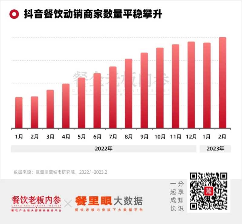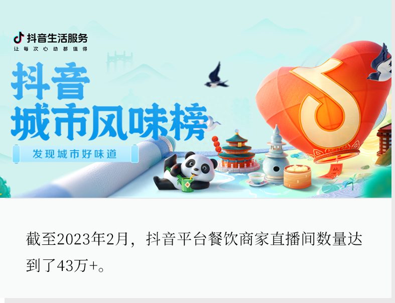 抖音平台餐饮兴趣用户的增长,和平台入驻餐饮商家的数量增长互为因果,相互促进。数据显示,2022年抖音平台餐饮动销商家数同比增长297%。截至2023年2月,餐饮商家直播间数量达到了43万+。