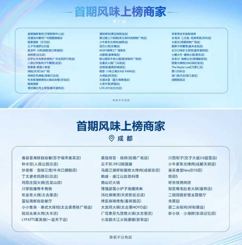 首批城市风味榜单公布10个城市,包括北京、上海、广州、深圳、沈阳、杭州、成都、重庆、武汉、长沙,共计340+家餐厅上榜。