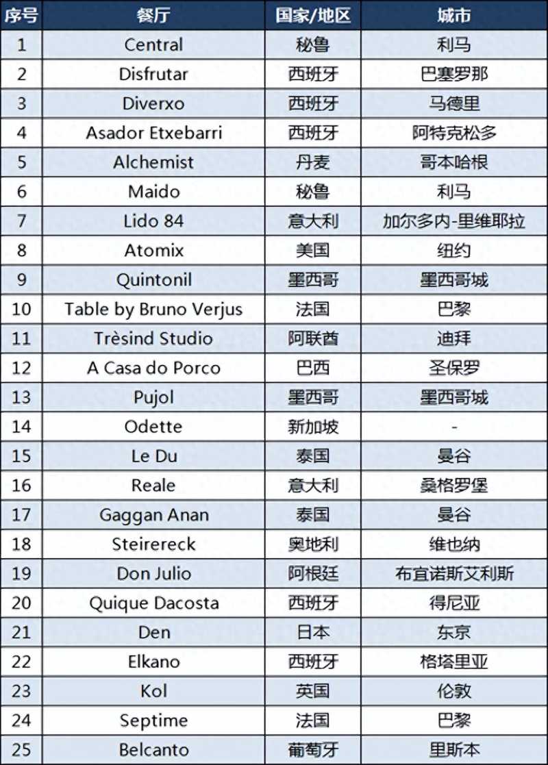 Central(秘鲁)、Disfrutar(西班牙)、Diverxo(西班牙)、Asador Etxebarri(西班牙)、Alchemist(丹麦)、Maido(秘鲁)、Lido 84(意大利)、Atomix(美国)、Quintonil(墨西哥)、Table by Bruno Verjus(法国)。