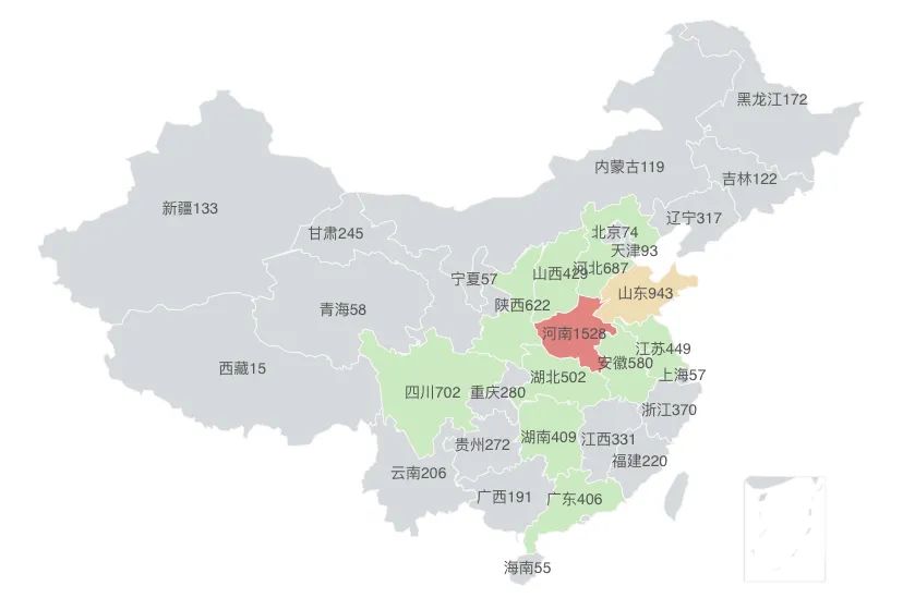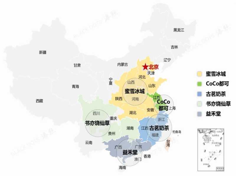 品牌以河南为中心阵地,向四周发散式布局站点,现如今门店遍布中国的各大城乡县。单从门店数量来看,绝对是茶饮品类数量规模的绝对霸主。