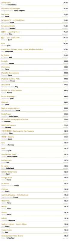 LA LISTE2024年度全球1000家最佳餐厅部分排名如下:
