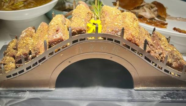宋风雅宴·宋文化地标餐厅位于金水东路与农业南路交叉口,装修充满了宋韵风格,仿佛置身于宋朝的宫廷之中,还有小姐姐的宋舞表演和飞花令环节。虹桥羊排,以汴京虹桥模型为餐具,别具一番风味。