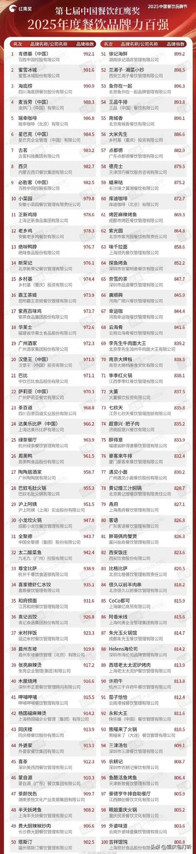 2025中国餐饮品牌100强排名大整理 第七届中国餐饮红鹰奖 “2025 年度餐饮品牌力百强” 榜单近日发布,这份以品牌指数为核心评价维度的榜单,不仅展现了当下中国餐饮市场的竞争格局,更折射出消费升级、数字化转型与供应链革新下的行业演进逻辑。本文 ... 餐饮行业01-20