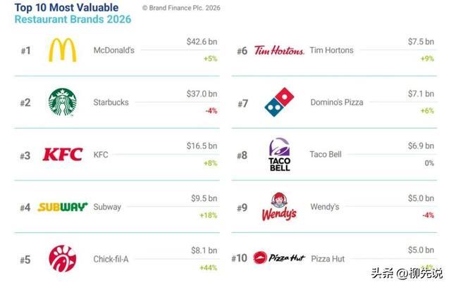 2026全球餐饮品牌价值榜单的前5名,依然被欧美老牌餐饮品牌占据,分别是麦当劳、星巴克、肯德基、赛百味以及Chick-fil-A。其中,排在榜首位置的麦当劳,品牌价值高达426亿美元(折合人民币约2950亿)。麦当劳在全球构建了高标准的供应链体系,通过规模化采购和集中配送控制成本。同时,凭借稳定的品牌形象和持续的产品创新,不断强化消费者心智,最终成就了其全球餐饮巨头的地位。