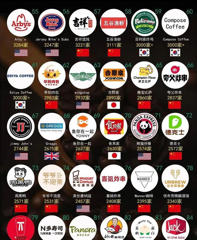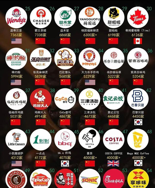 更讽刺的是,这还不是个例,简直是集体逆袭,我们的瑞幸咖啡,门店也逼近三万家,紧紧咬住星巴克不放,还有那个被戏称为“喷射战士”的华莱士,也默默开了一万九千多家店,挤进了全球前十,你以为这就完了,远远没有,榜单前一百名里,中国品牌足足占了五十五个,简直是半壁江山,比如库迪咖啡、古茗、塔斯汀这些新势力,还有绝味鸭脖、正新鸡排这种小吃摊王者,甚至连杨国福、张亮麻辣烫,卖馒头的芭比,门店都突破了五千家,这已经不是简单的船大了,这简直是一支联合舰队,直接开到了战场中央。