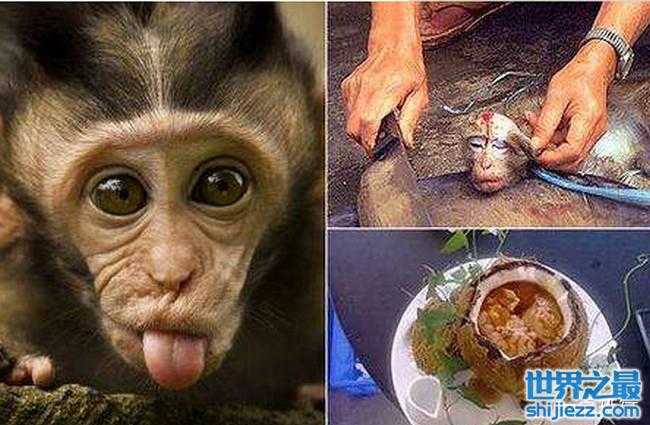 这里说的猴头不是猴头菇,而是真正的猴脑。吃的时候要先准备一个中间挖洞的桌子,这个洞正好能容一只青年猴子的头伸出。猴儿的头顶从小洞中伸出,用金属箍住,而且箍的十分紧,用小锤悄悄一敲,头盖骨应声而落,跟着桌下一声惨叫,拉开了生食猴脑惨状的序曲。这时可以看到猴脑如嫩豆腐一般,接着倒入已经热好的滚油,撒上葱花。食客用汤匙在猴脑袋里直接搅拌,继续倒入滚油,期间猴子一直惨叫,接着趁热舀食,吃法十分残忍。