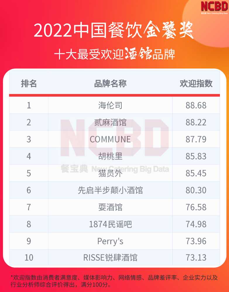 12、十大最受欢迎酒馆品牌:海伦司、贰麻酒馆、COMMUNE、胡桃里、猫员外、先启半步颠小酒馆、耍酒馆、1874民谣吧、Perry's、RISSE锐肆酒馆。