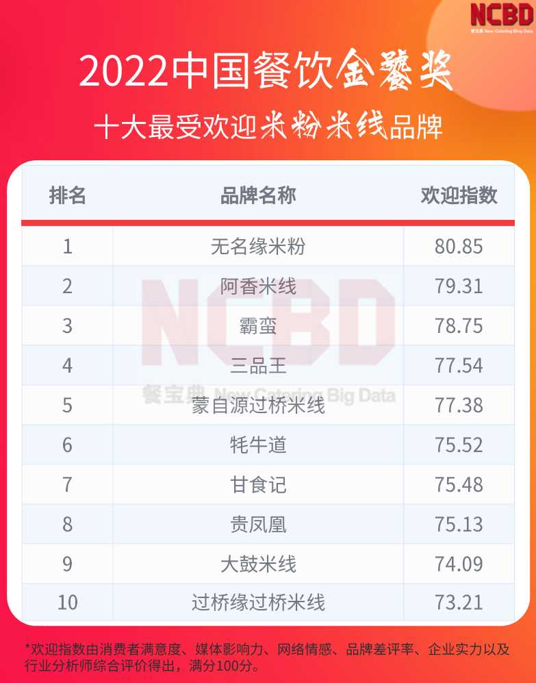 8、十大最受欢迎米粉米线品牌:无名缘米粉、阿香米线、霸蛮、三品王、蒙自源过桥米线、牦牛道、甘食记、贵凤凰、大鼓米线、过桥缘过桥米线。