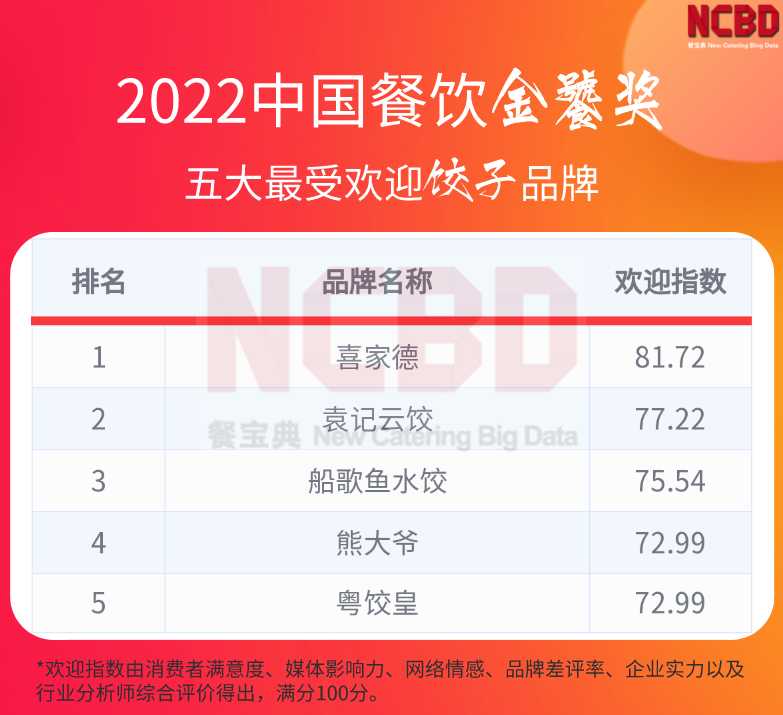 19、五大最受欢迎饺子品牌:喜家德、袁记云饺、船歌鱼水饺、熊大爷、粤饺皇。