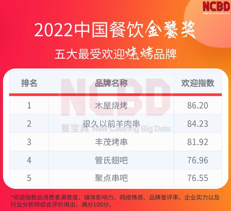 16、五大最受欢迎烧烤品牌:木屋烧烤、很久以前羊肉串、丰茂烤串、管氏翅吧、聚点串吧。