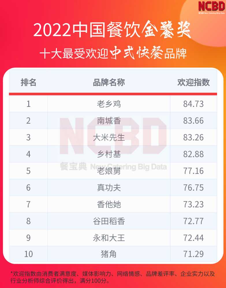 4、十大最受欢迎中式快餐品牌:老乡鸡、南城香、大米先生、乡村基、老娘舅、真功夫、香他她、谷田稻香、永和大王、猪角。