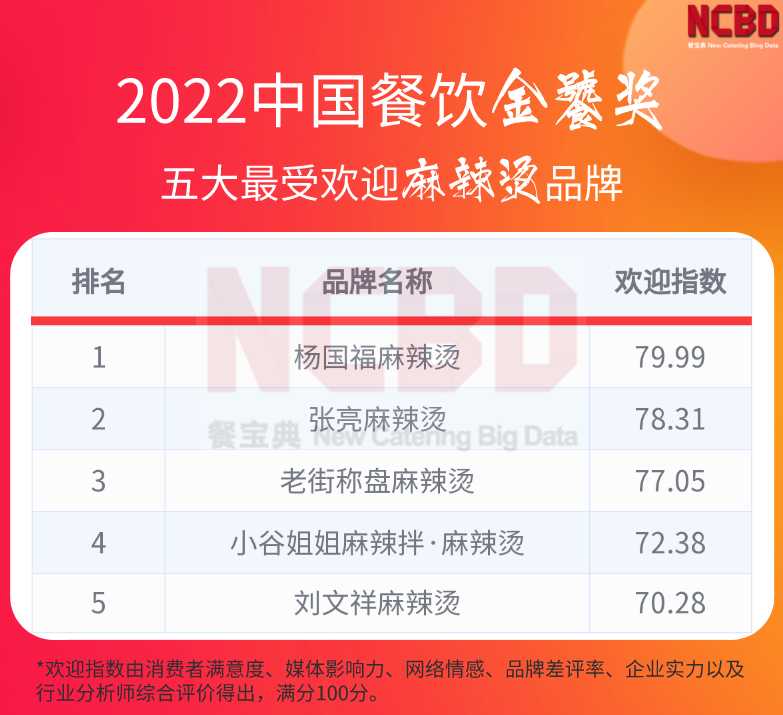 14、五大最受欢迎麻辣烫品牌:杨国福麻辣烫、张亮麻辣烫、老街称盘麻辣烫、小谷姐姐麻辣拌·麻辣烫、刘文祥麻辣烫。