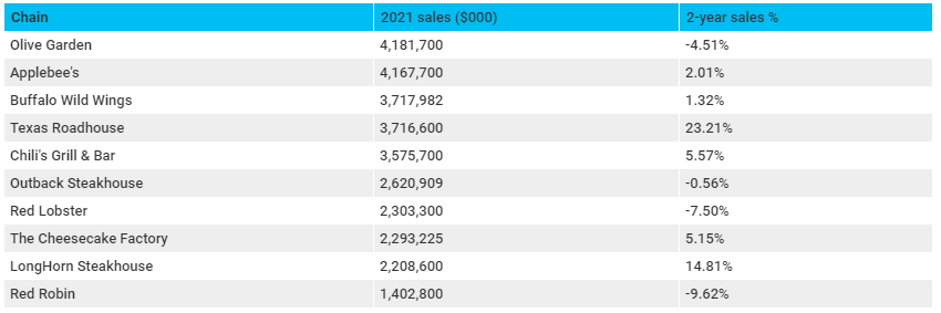 看看排名前十的这些连锁休闲餐饮企业,可以大致了解这种波动性。细分市场领导者Olive Garden的销售额比2019年下降了4.5% ,而其姊妹品牌LongHorn Steakhouse牛排餐厅的销售额增长了14.8%。
