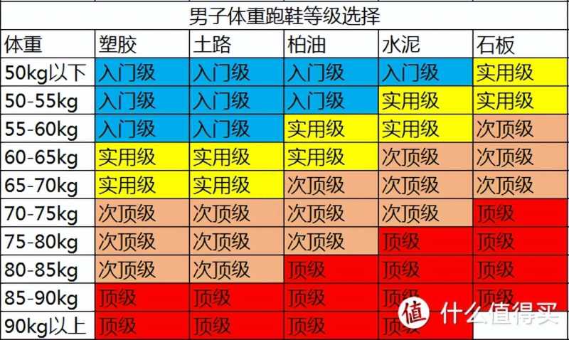 缓冲减震型跑鞋:正常足弓、正常内旋或高足弓、内旋不足-足内翻;稳定支撑型跑鞋:正常足弓、正常内旋或轻度低足弓、过度内旋-轻度足外翻。6.根据自己的体重及跑步场地类型选择对应等级的跑鞋