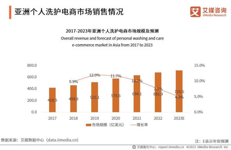 iiMedia Research(艾媒咨询)数据显示,截至2022年,亚洲个人洗护电商市场规模持续增长,其增长速度顺应全球个人洗护电商市场增长率回落趋势,出现逐步放缓现象。预计2023年亚洲个人洗护电商市场规模达715.6亿美元,增长率下降至4.9%。艾媒咨询分析师认为,中国电商市场是亚洲电商市场主体,亚洲个人洗护电商市场规模增长率的回落契合中国个人洗护电商市场进入平稳发展阶段的趋势。