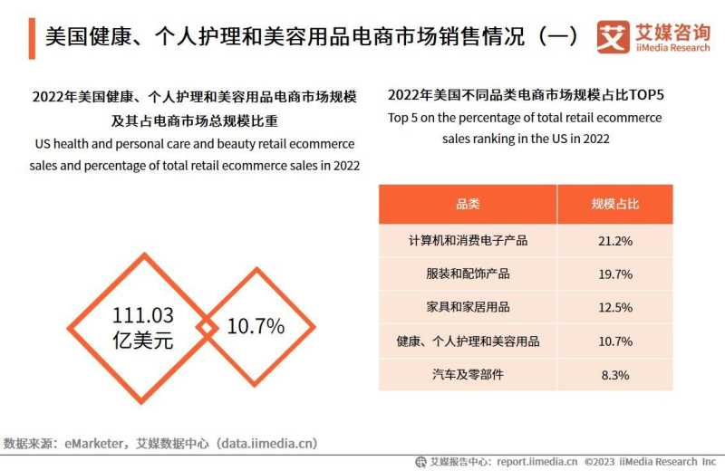 数据显示,2022年美国健康、个人护理和美容用品电商市场规模达111.03亿美元,占美国电商市场总规模的10.7%,该占比仅次于计算机和消费电子产品(21.2%)、服装和配饰产品(19.7%)、家具和家居用品(12.5%)的占比,在所有品类的占比中排名第四。艾媒咨询分析师认为,美国居民的个人护理意识较强,线上购买个人洗护用品的需求程度较大。