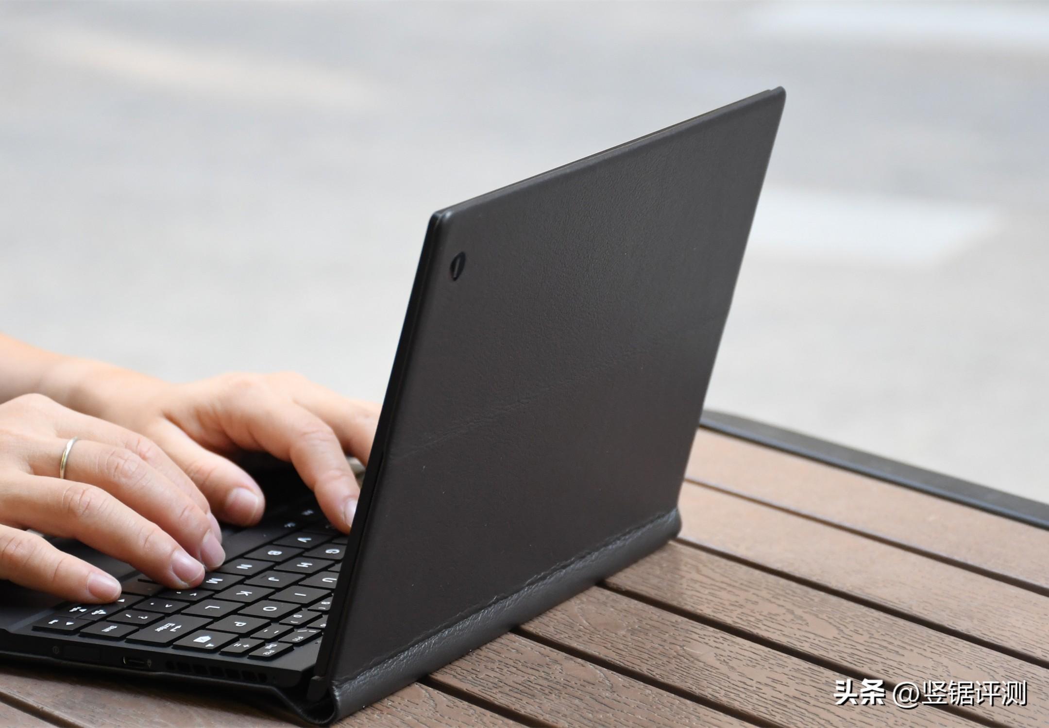 上图这种形态叫支架式平板电脑,比较适合用来看电影等,像工作之余或者出差途中,就可以切换至这种形态来用放松或打发时间。